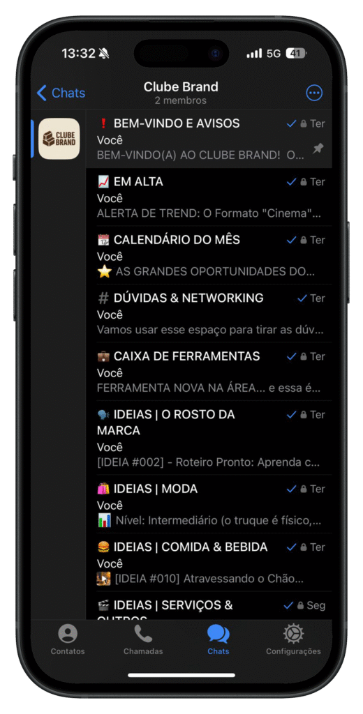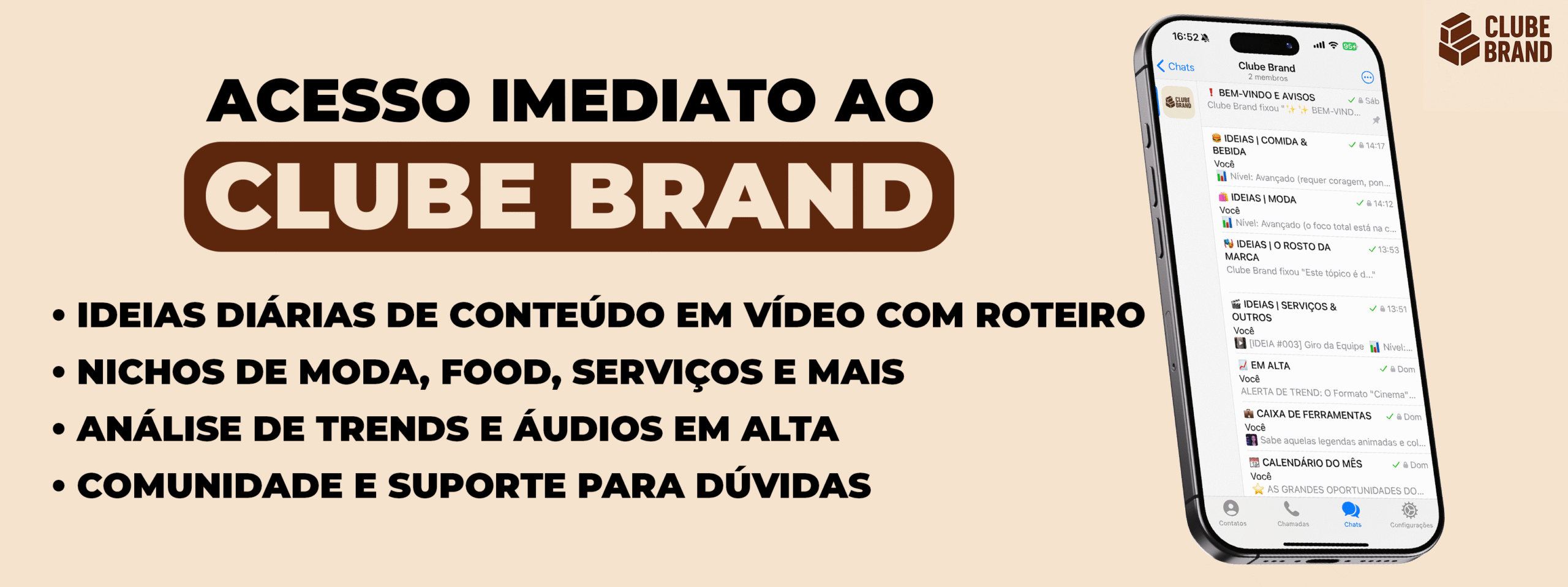 O Clube Brand é uma comunidade por assinatura que funciona como um Diretor Criativo. É um canal exclusivo no Telegram onde você recebe ideias diárias de vídeo, com roteiros prontos e passo a passo, para você apenas adaptar, gravar e postar. É a solução definitiva para o bloqueio criativo..