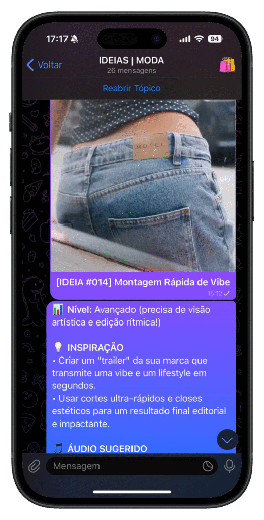 O coração do Clube. Todo dia, uma nova ideia de vídeo validada com roteiro passo a passo. É só adaptar para o seu nicho (Moda, Food, Serviços) e gravar.